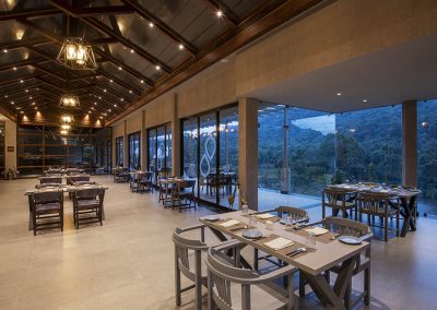 Niraamaya Retreats Samroha is perched on a cliff and surrounded by rugged hills, lush green forests, and magnificent views of Athirappilly Falls.
