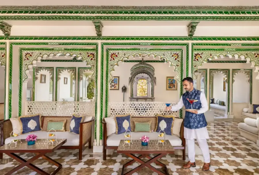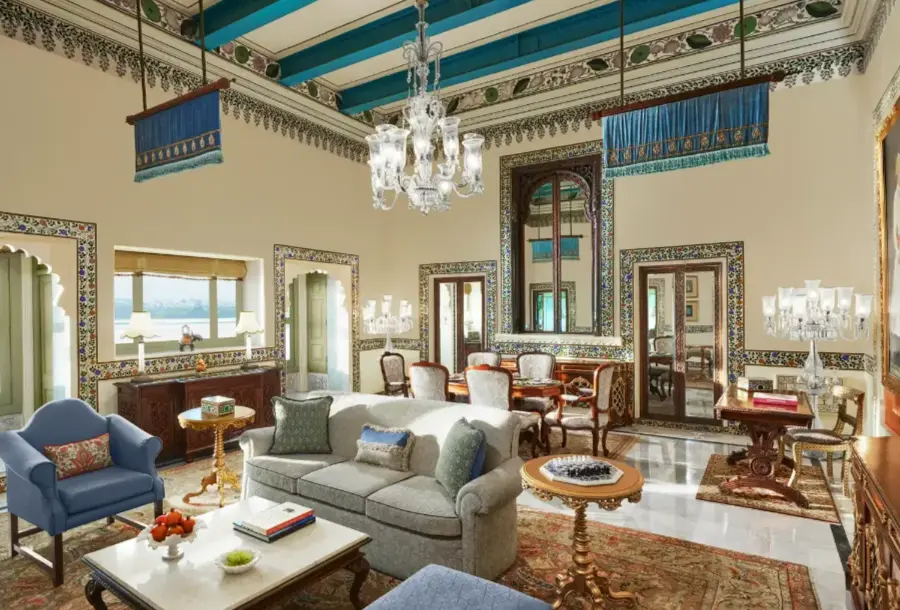 Taj Lake Palace sits in the middle of Lake Pichola, built with marble, and features majestic architecture to captivate guests.